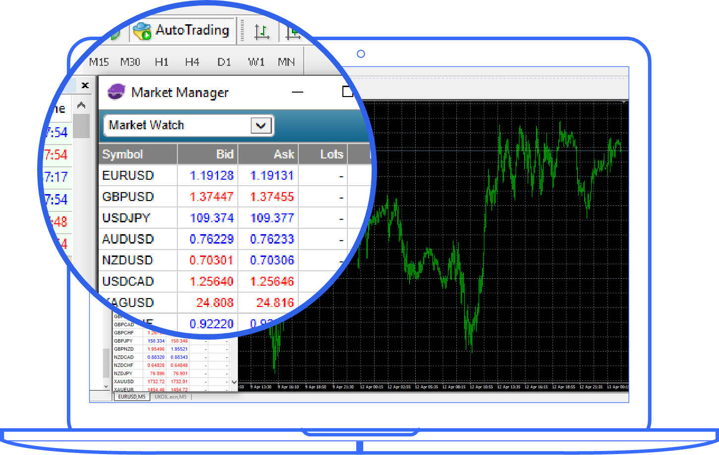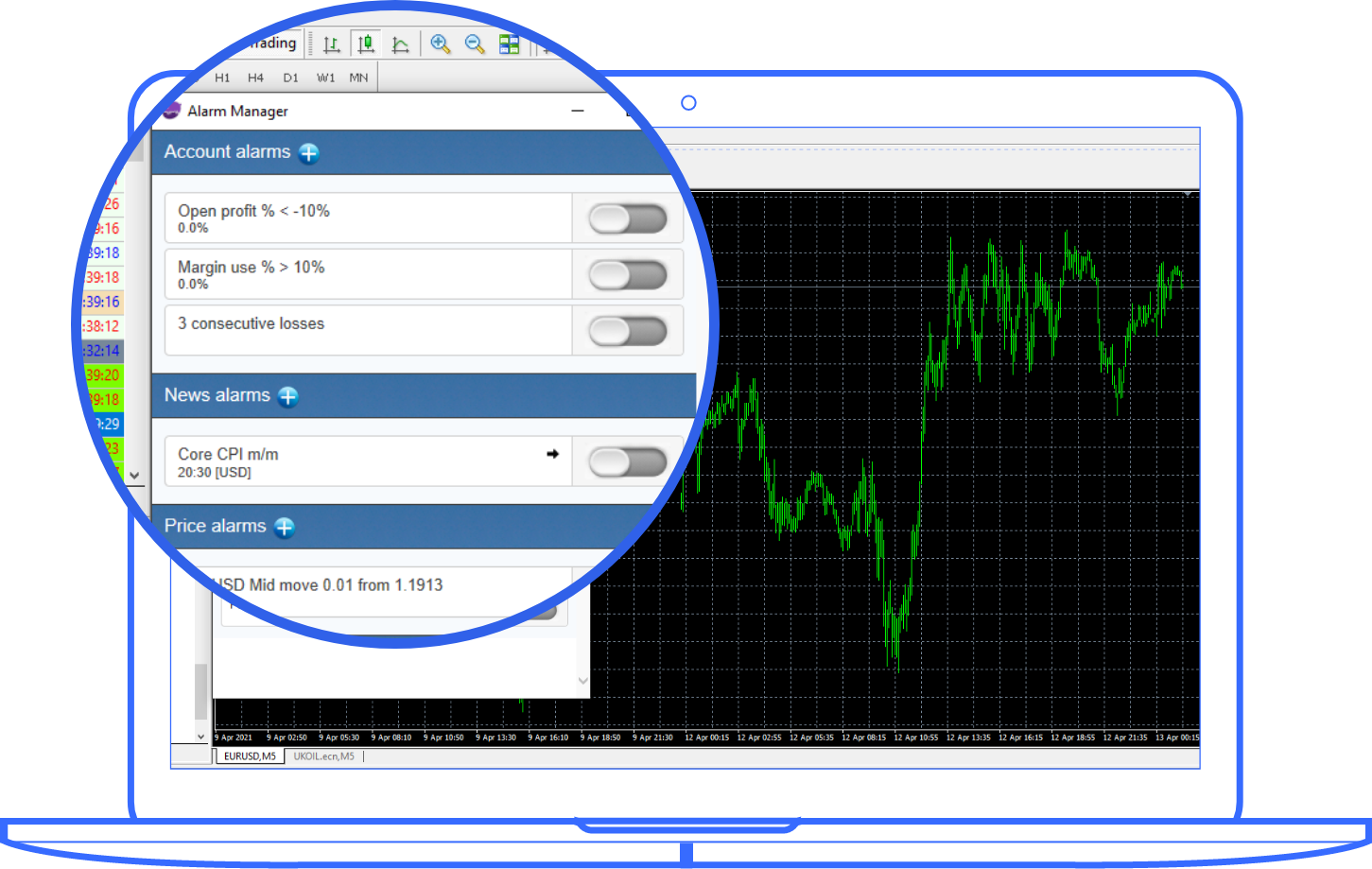 Get notified with released news events, changes in price action, or simply create a personalized alarm manager to get alerts on events such as margin usage, trade entries, and exits, etc.