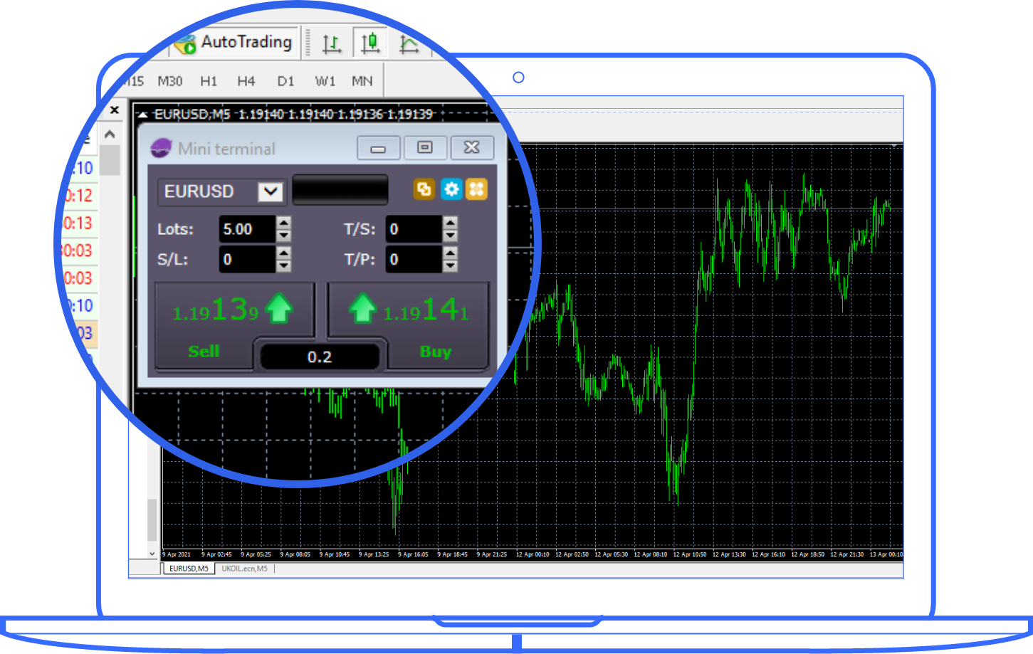 Click Buy or Sell to place a buy or sell order, respectively. Mini Terminal lets you manage risk and position size by adding smart lines to place multiple stops, take profits or issue simple partial close commands.