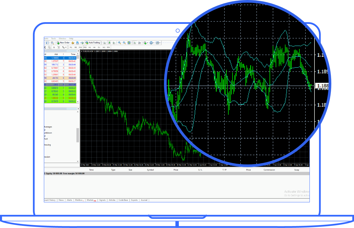 Start trading using popular trading indicators such as Bollinger Bands, Ichimoku Kinko Hyo, MACD, Parabolic SAR, Stochastic Indicator, RSI, and many more.