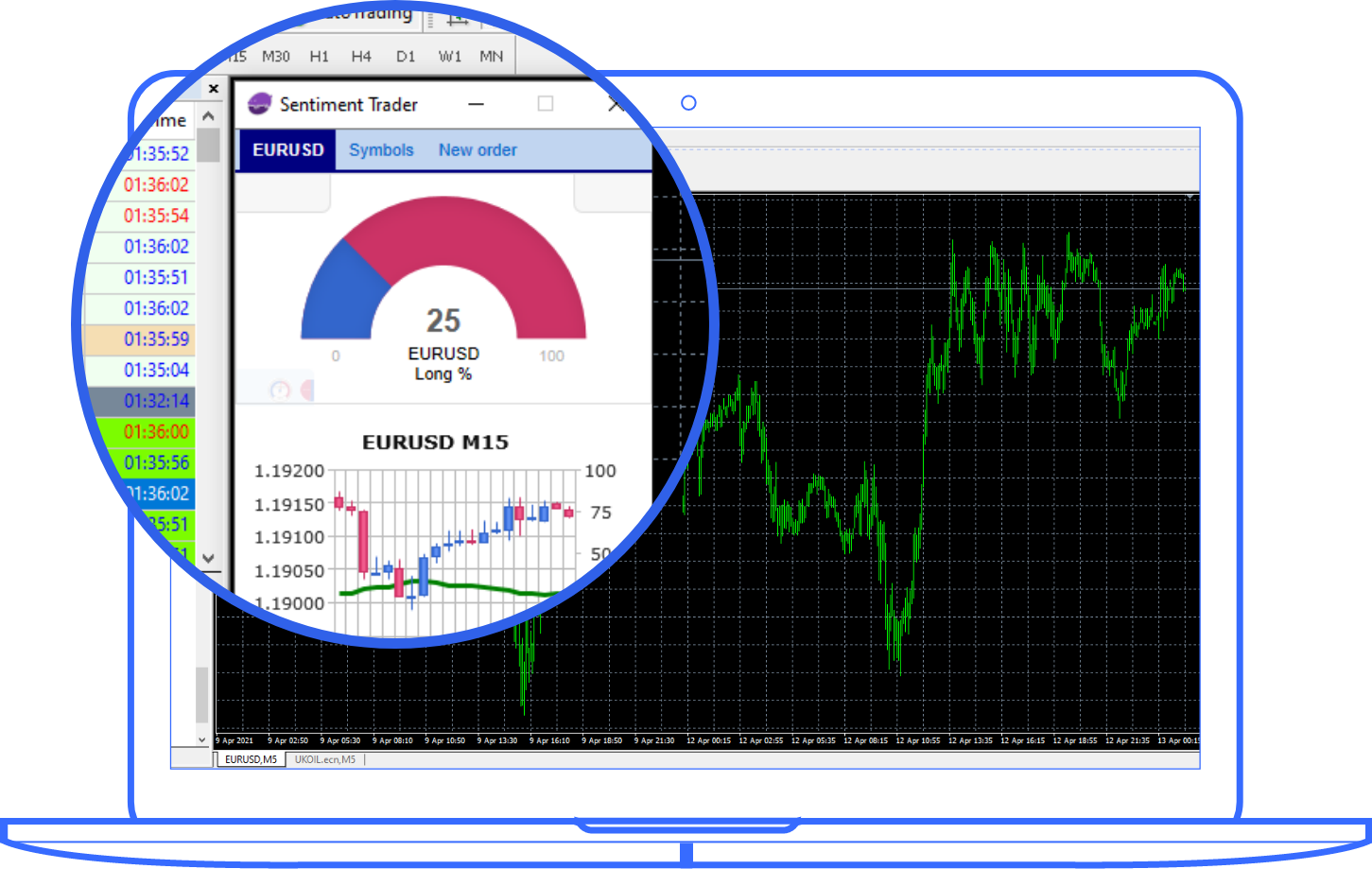 It displays information about live and past data across markets. The sentiment figure is derived based on real-money accounts, in other words, it's the percentage of trades who currently have/had an open buy or sell position.