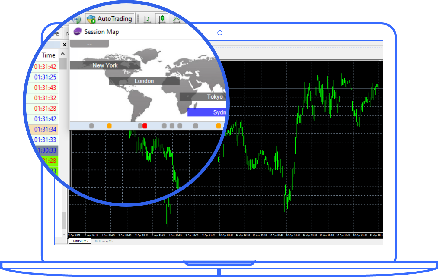 It is a global map that is real-time pending market sessions in local time. You will also be able to see news markers for economic data releases which are color-coded by importance.
